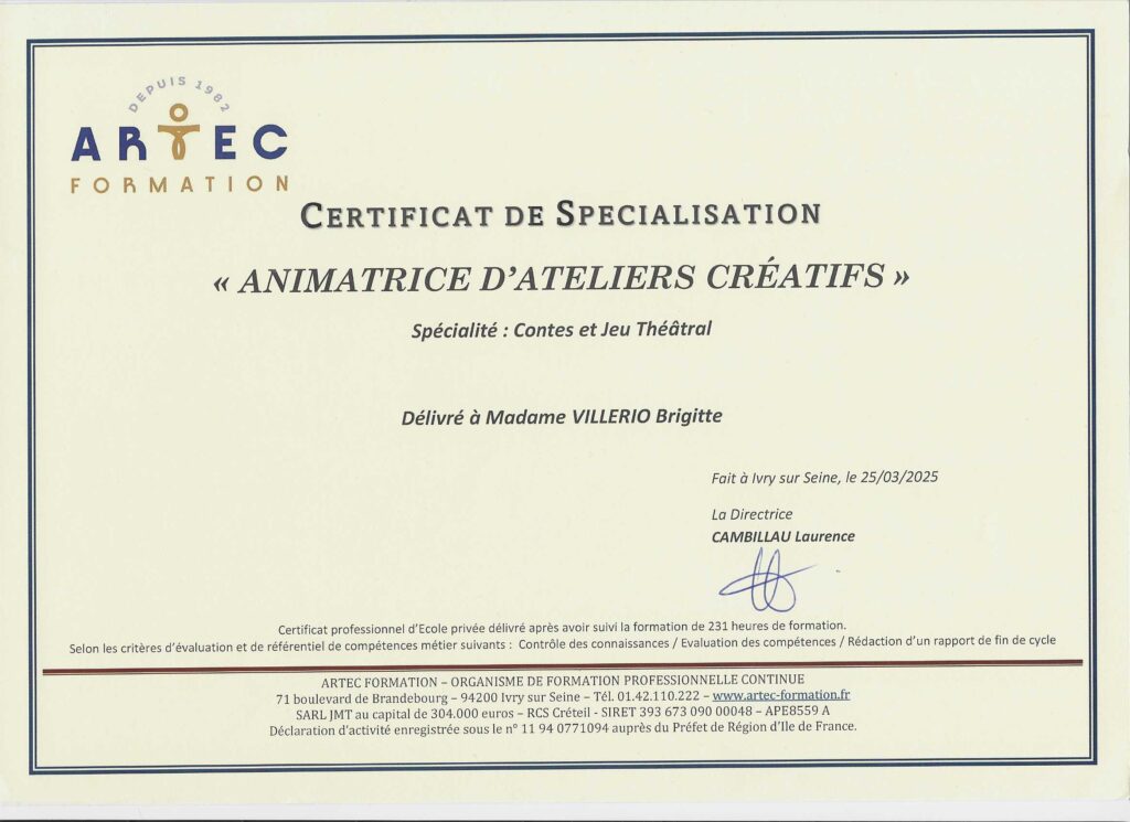 Je suis certifiée « Animatrice d’ateliers créatifs à visée de bien-être » de l’Artec formation
